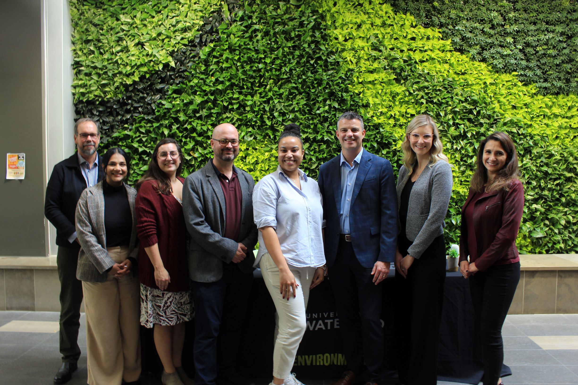 From left to right: Bruce Frayne, Dean, Faculty of Environment, Bianca Rocha, Purpose Integration Specialist, Libro, Alyssa Stephens, Psychological Health and Wellbeing Coordinator, House of Friendship, Sean Geobey, Associate Professor and Director of Waterloo Institute for Complexity and Innovation (WICI), Vestiana Powell, Advancement Coordinator, Faculty of Environment, Scott MacLeod, Regional Manager, Community Banking, Libro, Ashleigh Thomas, Community Manager, Libro, Carolina Triana, Purpose Integration Specialist, Libro